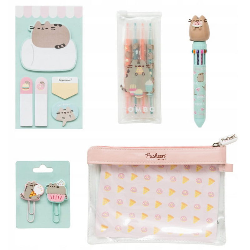 Pusheen Zestaw szkolny w piórniku [KPGE001] Piórnik Pusheen, przeźroczysty, wykonany z miękkiego PCV, łatwy do czyszczenia. Zapinany na suwak. Wyposażenie:Długopis z figurką kotka Pusheen 3D – 10 kolorów wkładów, Kolory wkładów: różowy, niebieski – 2x, fioletowy, żółty, zielony, pomarańczowy, czarny, czerwony, brązowyZakreślacze 4szt dwustronne4 kolory zakreślaczy (różowy, pomarańczowy, zielony, niebieski)Każdy zakreślacz ma 2 końcówki: szeroką…