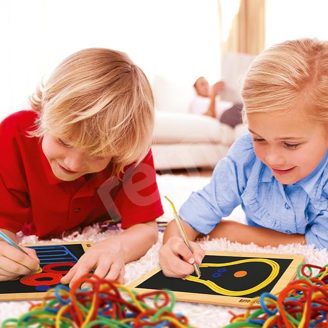 Ze sznurków, które łatwo przyczepiają się do rzepu, dziecko szybko może tworzyć kolorowe obrazy. Zestaw zawiera: latarka LED 16 kolorowych sznurówek w 5 kolorach i różnych długościach „mały tablet” – tabliczkę z rzepem uchwyt – obsadka długopisu zestaw kolorowych filców pojemniczek do przechowywania filców 4 karty pracy = 8 obrazków do odwzorowania Produkt całkowicie zaprojektowany…