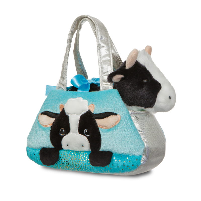 Fantastyczny kumpel Krówka siedzi w ślicznej błękitno-srebrnej torebce.