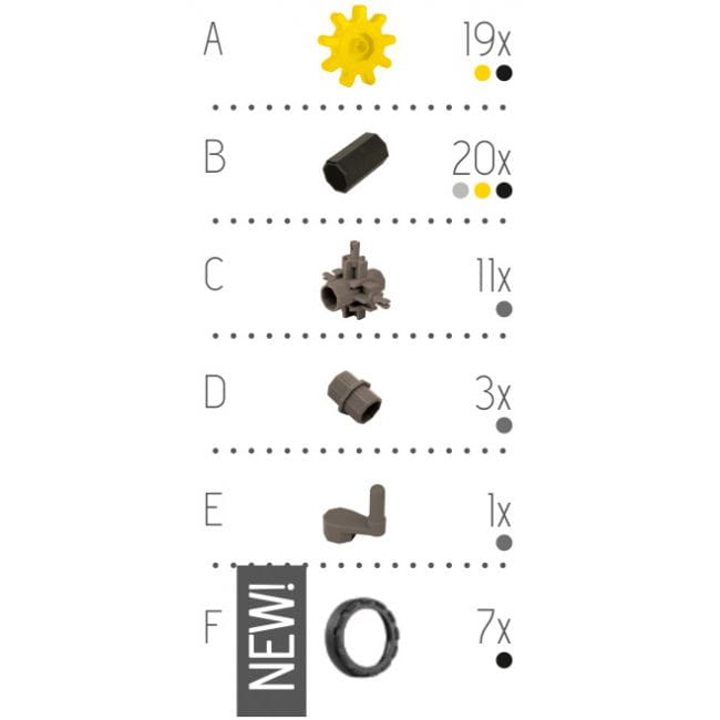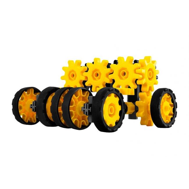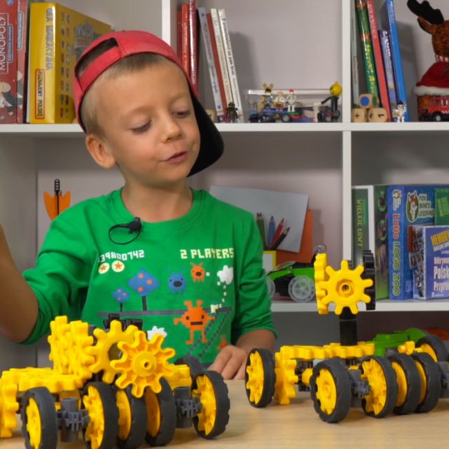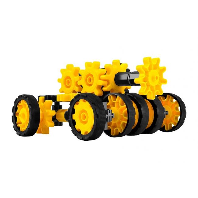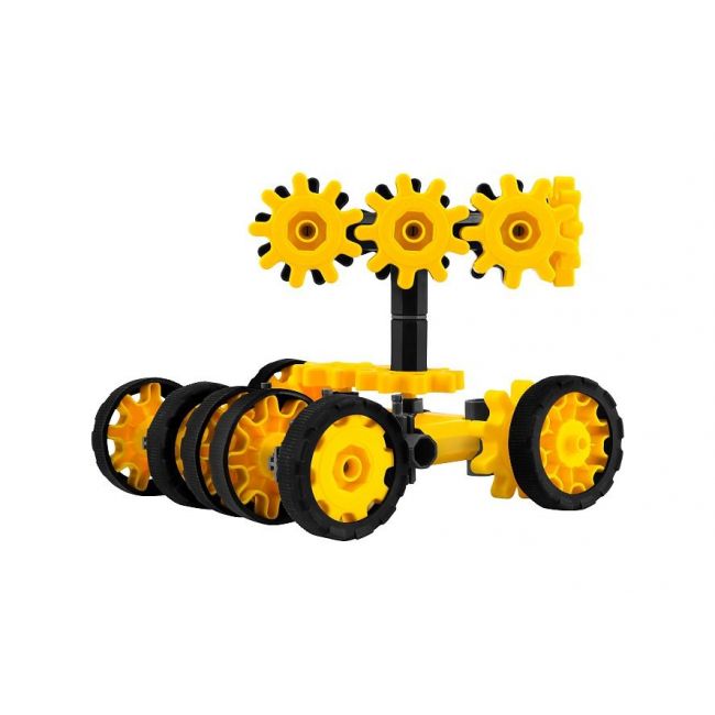 Kosmiczny nieziemski pojazd składający się niekonwencjonalnie z 7 kół z czarnymi oponami. Przy poruszaniu się całości wszystkie 19 kół zębatych kręci się równocześnie. To już jest małe wyzwanie dla małego konstruktora. Przy poruszaniu się pojazdu koła napędowe napędzają wszystkie pozostałe koła zębate powodując fantastyczny efekt odlotowej konstrukcji. Przekładając wg instrukcji 4- 5 elementów można szybko jeden pojazd przeobrazić w całkiem inny, np. kosmiczny radar w pojazd badawczy. Czy to czegoś Wam nie przypomina? Zestaw kompatybilny z innymi zestawami KORBO.