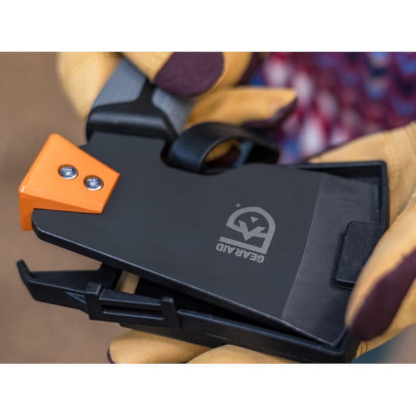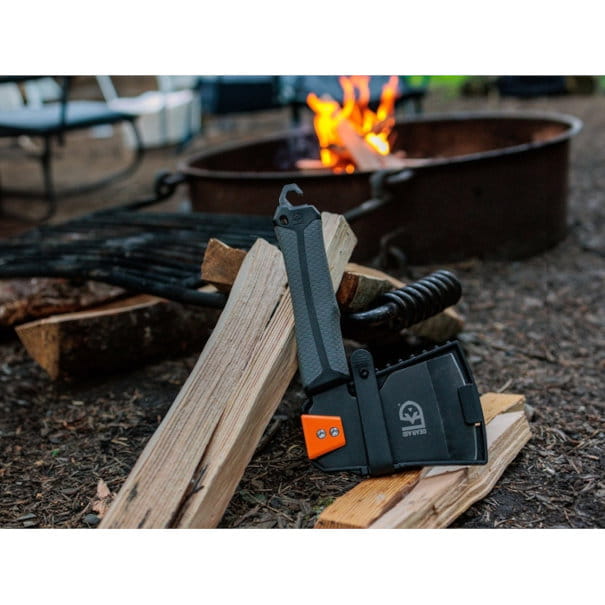 • Wytrzymałe etui chroni ostrze podczas przebywania na obozie, w plecaku lub gdy jest używane jako młotek lub wyciągacz palików.